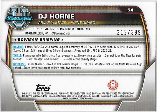 DJ Horne Purple Mini Diamond #54 2022 Bowman Chrome University 1st Bowman /399