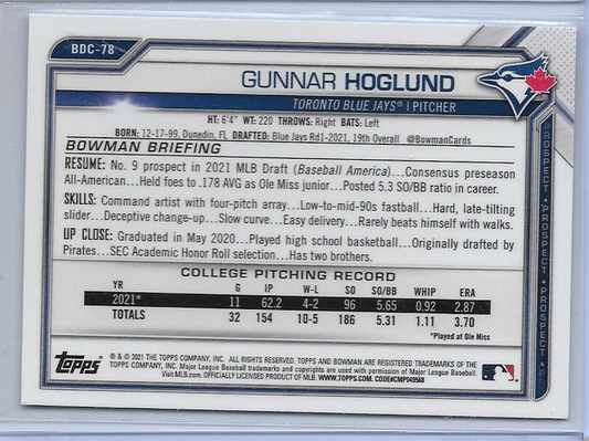 GUNNAR HOGLUND #BDC-78 2021 Bowman Draft Sky Blue Refractor - Blue Jays