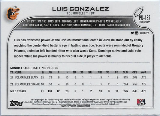 Luis Gonzalez [Autograph] #PD-182 2022 Topps Pro Debut Orioles Prospect