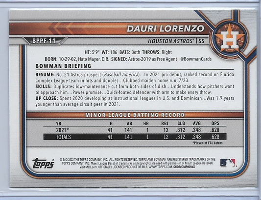 Dauri Lorenzo [Sky Blue Foil] #BPPF-11 2022 Bowman 1st Edition Houston Astros