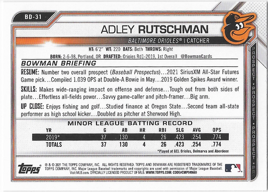 Adley Rutschman #BD-31 - 2021 Bowman Paper Baltimore Orioles