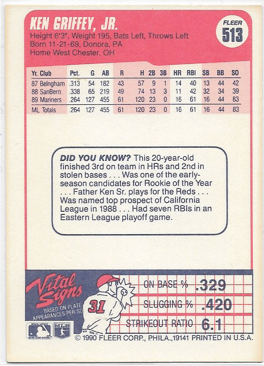 Ken Griffey Jr #513 1990 Fleer Baseball